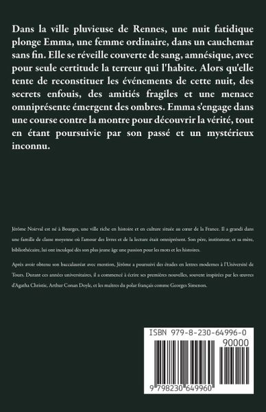 Dans la ville pluvieuse de Rennes, une nuit fatidique plonge Emma, une femme ordinaire, dans un cauchemar sans fin. Elle se réveille couverte de sang, amnésique, avec pour seule certitude la terreur qui l'habite. Alors qu'elle tente de reconstituer les événements de cette nuit, des secrets enfouis, des amitiés fragiles et une menace omniprésente émergent des ombres. Emma s'engage dans une course contre la montre pour découvrir la vérité, tout en étant poursuivie par son passé et un mystérieux inconnu.
