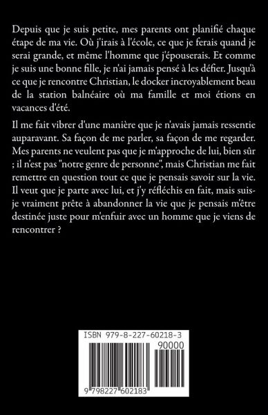 Depuis que je suis petite, mes parents ont planifié chaque étape de ma vie. Où j'irais à l'école, ce que je ferais quand je serai grande, et même l'homme que j'épouserais. Et comme je suis une bonne fille, je n'ai jamais pensé à les défier. Jusqu'à ce que je rencontre Christian, le docker incroyablement beau de la station balnéaire où ma famille et moi étions en vacances d'été. Il me fait vibrer d'une manière que je n'avais jamais ressentie auparavant. Sa façon de me parler, sa façon de me regarder. Mes parents ne veulent pas que je m'approche de lui, bien sûr ; il n'est pas "notre genre de personne", mais Christian me fait remettre en question tout ce que je pensais savoir sur la vie. Il veut que je parte avec lui, et j'y réfléchis en fait, mais suis-je vraiment prête à abandonner la vie que je pensais m'être destinée juste pour m'enfuir avec un homme que je viens de rencontrer ?