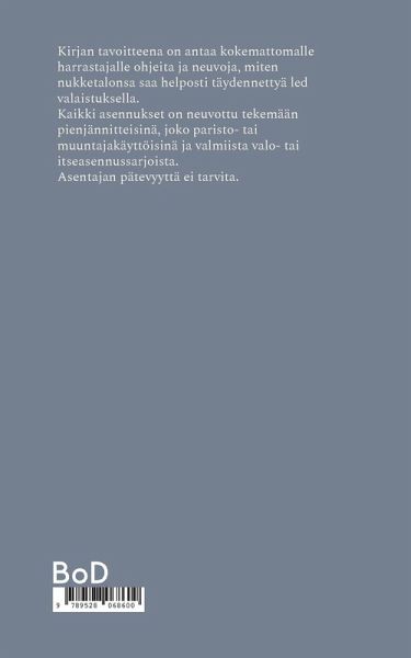 Kirjan tavoitteena on antaa kokemattomalle harrastajalle ohjeita ja neuvoja, miten nukketalonsa saa helposti täydennettyä led valaistuksella. Kaikki asennukset on neuvottu tekemään pienjännitteisinä, joko paristo- tai muuntajakäyttöisinä ja valmiista valo- tai itseasennussarjoista. Asentajan pätevyyttä ei tarvita.