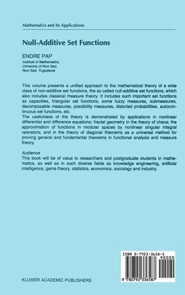 This volume presents a unified approach to the mathematical theory of a wide class of non-additive set functions, the so called null-additive set functions, which also includes classical measure theory. It includes such important set functions as capacities, triangular set functions, some fuzzy measures, submeasures, decomposable measures, possibility measures, distorted probabilities, autocontinuous set functions, etc.