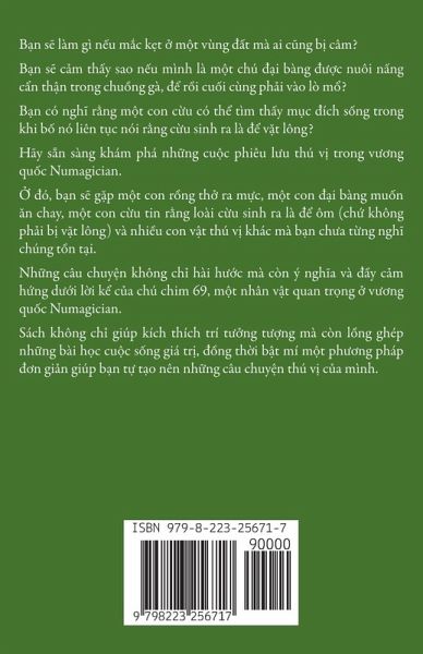 B¿n s¿ làm gì n¿u m¿c k¿t ¿ m¿t vùng ¿¿t mà ai c¿ng b¿ câm? B¿n s¿ c¿m th¿y sao n¿u mình là m¿t chú ¿¿i bàng ¿¿¿c nuôi n¿ng c¿n th¿n trong chüng gà, ¿¿ r¿i cüi cùng ph¿i vào lò m¿? B¿n có ngh¿ r¿ng m¿t con c¿u có th¿ tìm th¿y m¿c ¿ích s¿ng trong khi b¿ nó liên t¿c nói r¿ng c¿u sinh ra là ¿¿ v¿t lông? Hãy s¿n sàng khám phá nh¿ng cüc phiêu l¿u thú v¿ trong v¿¿ng qüc Numagician. ¿ ¿ó, b¿n s¿ g¿p m¿t con r¿ng th¿ ra m¿c, m¿t con ¿¿i bàng mün ¿n chay, m¿t con c¿u tin r¿ng loài c¿u sinh ra là ¿¿ ôm (ch¿ không ph¿i b¿ v¿t lông) và nhi¿u con v¿t thú v¿ khác mà b¿n ch¿a t¿ng ngh¿ chúng t¿n t¿i. Nh¿ng câu chuy¿n không ch¿ hài h¿¿c mà còn ý ngh¿a và ¿¿y c¿m h¿ng d¿¿i l¿i k¿ c¿a chú chim 69, m¿t nhân v¿t quan tr¿ng ¿ v¿¿ng qüc Numagician. Sách không ch¿ giúp kích thích trí t¿¿ng t¿¿ng mà còn l¿ng ghép nh¿ng bài h¿c cüc s¿ng giá tr¿, ¿¿ng th¿i b¿t mí m¿t ph¿¿ng pháp ¿¿n gi¿n giúp b¿n t¿ t¿o nên nh¿ng câu chuy¿n thú v¿ c¿a mình.