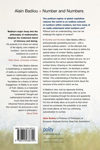 In Number and Numbers Alain Badiou offers an philosophically penetrating account with a powerful political subtext of the attempts that have been made over the last century to define the special status of number. Badiou argues that number cannot be defined by the multiform calculative uses to which numbers are put, nor is it exhausted by the various species described by number theory. Drawing on the mathematical theory of surreal numbers, he develops a unified theory of Number as a particular form of being, an infinite expanse to which our access remains limited. This understanding of Number as being harbours important philosophical truths about the structure of the world in which we live.