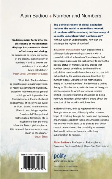 In Number and Numbers Alain Badiou offers an philosophically penetrating account with a powerful political subtext of the attempts that have been made over the last century to define the special status of number. Badiou argues that number cannot be defined by the multiform calculative uses to which numbers are put, nor is it exhausted by the various species described by number theory. Drawing on the mathematical theory of surreal numbers, he develops a unified theory of Number as a particular form of being, an infinite expanse to which our access remains limited. This understanding of Number as being harbours important philosophical truths about the structure of the world in which we live.