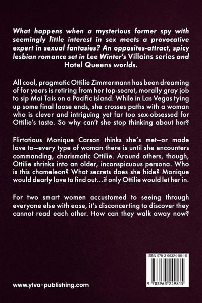 What happens when a mysterious former spy with seemingly little interest in sex meets a provocative expert in sexual fantasies? An opposites-attract, spicy lesbian romance set in Lee Winter's Villains series and Hotel Queens worlds. All cool, pragmatic Ottilie Zimmermann has been dreaming of for years is retiring from her top-secret, morally gray job to sip Mai Tais on a Pacific island. While in Las Vegas tying up some final loose ends, she crosses paths with a woman who is clever and intriguing yet far too sex-obsessed for Ottilie's taste. So why can't she stop thinking about her? Flirtatious Monique Carson thinks she's met-or made love to-every type of woman there is until she encounters commanding, charismatic Ottilie. Around others, though, Ottilie shrinks into an older, inconspicuous persona. Who is this chameleon? What secrets does she hide? Monique would dearly love to find out...if only Ottilie would let her in. For two smart women accustomed to seeing through everyone else with ease, it's disconcerting to discover they cannot read each other. How can they walk away now?