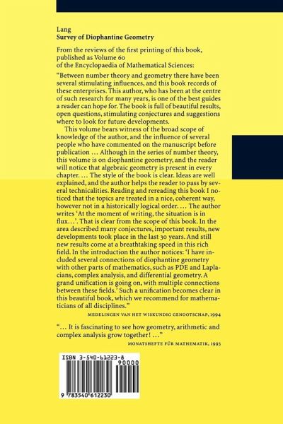 In 1988 Shafarevich asked me to write a volume for the Encyclopaedia of Mathematical Sciences on Diophantine Geometry. I said yes, and here is the volume. By definition, diophantine problems concern the solutions of equations in integers, or rational numbers, or various generalizations, such as finitely generated rings over Z or finitely generated fields over Q. The word Geometry is tacked on to suggest geometric methods. This means that the present volume is not elementary. For a survey of some basic problems with a much more elementary approach, see [La 9Oc]. The field of diophantine geometry is now moving quite rapidly. Out standing conjectures ranging from decades back are being proved. I have tried to give the book some sort of coherence and permanence by em phasizing structural conjectures as much as results, so that one has a clear picture of the field. On the whole, I omit proofs, according to the boundary conditions of the encyclopedia. On some occasions I do give some ideasfor the proofs when these are especially important. In any case, a lengthy bibliography refers to papers and books where proofs may be found. I have also followed Shafarevich's suggestion to give examples, and I have especially chosen these examples which show how some classical problems do or do not get solved by contemporary in sights. Fermat's last theorem occupies an intermediate position. Al though it is not proved, it is not an isolated problem any more.
