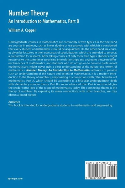 Undergraduate courses in mathematics are commonly of two types. On the one hand are courses in subjects - such as linear algebra or real analysis - with which it is considered that every student of mathematics should be acquainted. On the other hand are courses given by lecturers in their own areas of specialization, which are intended to serve as a preparation for research. But after taking courses of only these two types, students might not perceive the sometimes surprising interrelationships and analogies between different branches of mathematics, and students who do not go on to become professional mathematicians might never gain a clear understanding of the nature and extent of mathematics. The two-volume Number Theory: An Introduction to Mathematics attempts to provide such an understanding of the nature and extent of mathematics. It is a modern introduction to the theory of numbers, emphasizing its connections with other branches of mathematics. Part A, which should beaccessible to a first-year undergraduate, deals with elementary number theory. Part B is more advanced than the first and should give the reader some idea of the scope of mathematics today. The connecting theme is the theory of numbers, at first sight one of the most abstruse and irrelevant branches of mathematics. Yet by exploring its many connections with other branches, we may obtain a broad picture.