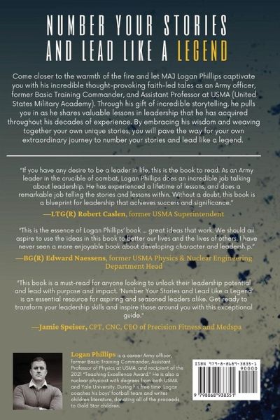 Find solace in the comforting glow of the crackling fire as you draw nearer, for it is here that MAJ Logan Phillips awaits to captivate your imagination. With his incredible ability to weave thought-provoking tales, infused with the guiding light of faith, he invites you into a world of inspiration and introspection. As an esteemed Army officer, former Basic Training Commander, and Assitant Professor at USMA, his wealth of experience shines through in every word he shares. Prepare to be spellbound as MAJ Logan Phillips employs his gift of storytelling to transport you to the heart of his journey. Through his narratives, he imparts profound wisdom and invaluable lessons in leadership, honed over the span of decades spent in service. Each tale carries within it a treasure trove of insight, carefully crafted to ignite the spark of greatness within you. But it doesn't end with merely absorbing his wisdom. MAJ Logan Phillips encourages you to embrace your own unique stories, for within them lies the power to shape your destiny. By intertwining his teachings with your personal experiences, you embark upon a remarkable journey of self-discovery and growth. As you navigate this path, you will not only number your own stories but also learn to lead with the grace and strength of a true legend. So, draw near, dear friend, and allow MAJ Logan Phillips to ignite the flames of inspiration within your soul. Together, we shall embark on an extraordinary voyage, where the fire's warmth shall guide us, and the power of storytelling shall illuminate our path. "If you have any desire to be a leader in life, this is the book to read. As an Army leader in the crucible of combat, Logan Phillips does an incredible job talking about leadership. He has experienced a lifetime of lessons, and does a remarkable job telling the stories and lessons within. Without a doubt, this book is a blueprint for leadership that achieves success and significance." -LTG(R) Robert Caslen, former USMA Superintendent ¿¿¿¿¿¿"This is the essence of Logan Phillips' book ... great ideas that work. We should all aspire to use the ideas in this book to better our lives and the lives of others. I have never seen a more enjoyable book about developing character and leadership." -BG(R) Edward Naessens, former USMA Physics & Nuclear Engineering Department Head ¿¿¿¿"This book is a must-read for anyone looking to unlock their leadership potential and lead with purpose and impact. 'Number Your Stories and Lead Like a Legend' is an essential resource for aspiring and seasoned leaders alike. Get ready to transform your leadership skills and inspire those around you with this exceptional guide." -Jamie Speiser, CPT, CNC, CEO of Precision Fitness and Medspa