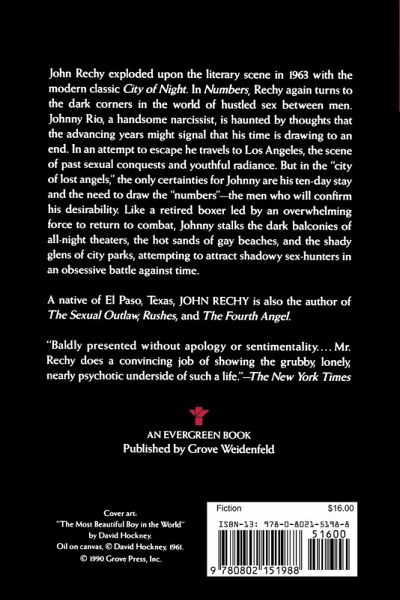 Book jacket/back: Johnny Rio, a handsome narcissist but no longer a pretty boy, travels to Los Angeles, the site of past sexual conquest and remembered youthful radiance, in a frenzied attempt to recreate his younger self. Johnny has ten precious days to draw the "numbers," the men who will confirm his desirability, and with the hungry focus of a man on borrowed time, he stalks the dark balconies of all-night theaters, the hot sands of gay beaches, and shady glens of city parks, attempting to attract shadowy sex-hunters in an obcessive battle against the passing of his youth.