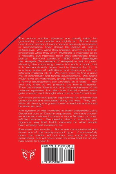 The various number systems are usually taken for granted by most people, and rightly so. But at least once in the career of every person seriously interested in mathematics, they should be looked at with a critical eye. Why were they created, and why are their properties what they are? Numbers is intended to be a readable but rigorous book that addresses these points. Edmund Landau’s 1930 book Grundlagen der Analysis (Foundations of Analysis) is still in print, showing the continuing desire for such a book, but it is extraordinarily terse, and is famous for it. It is a long string of definitions and theorems with no informal material at all. We have tried to find a good mix of informality and formal development. We spend much time on motivation, giving informal reasons why a formal development can proceed as it does. Then and only then do we present the formal material. Thus the reader learns not only the mechanism of the number systems, but also how formal mathematics gets created and thought about at a pre-formal level. The role of set theory and its relationship to the number systems is important, but in a book concentrating on numbers it is rather diversionary. Some set theory is necessary, of course, but the principles needed are simple and straightforward. We assume they are part of the reader's logical machinery and go on from there. A few foundational issues are mentioned, but this is not a book on set theory. Common pencil-and-paper algorithms for arithmetical computation are discussed along the way. They are, after all, among the great human creations and should be seen as such. The system of real numbers is often presented using Dedekind cuts or Cauchy sequences. We have chosen an approach whose intuition is more familiar to most: infinite decimals. We develop them in a simple, yet rigorous, way that builds naturally on what people have already had exposure to. Exercises are included. Some are computational and some are of the supply-a-proof type. If successfully done, the reader will not only have come to know something, but will have come to know that he or she has come to know it.