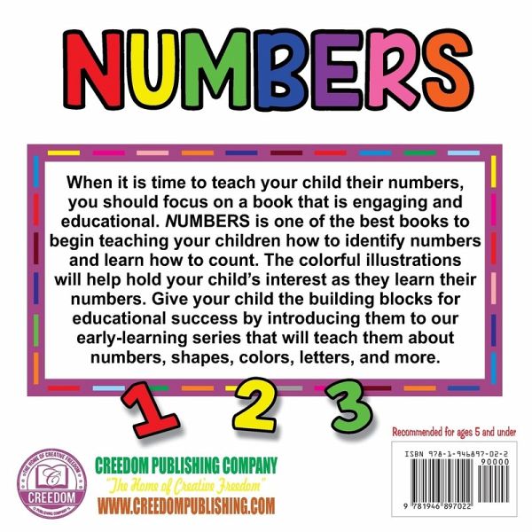Teach your preschool child how to count and encourage learning with the Numbers book. This book is designed to be a toddler favorite with fun designs for each letter, from 1 to 20. Develop your child's learning skills with the Creedom Early Learners Collection, which includes the following books: Animal Alphabet, Numbers, Shapes, Colors, Fruits, Vegetables, and more. The Creedom Early Learners Collection is specially designed to captivate a preschooler's attention while building the foundation for learning.