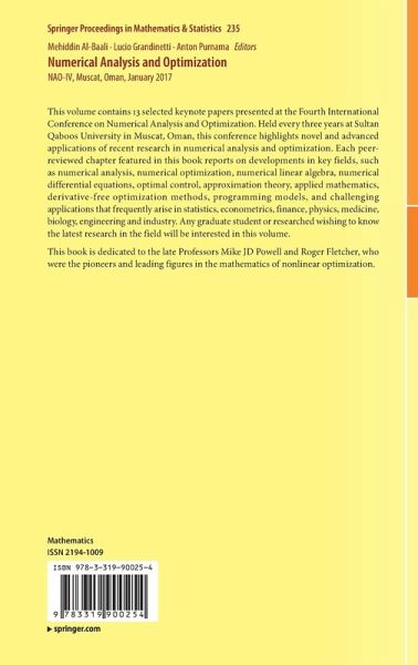 This volume contains 13 selected keynote papers presented at the Fourth International Conference on Numerical Analysis and Optimization. Held every three years at Sultan Qaboos University in Muscat, Oman, this conference highlights novel and advanced applications of recent research in numerical analysis and optimization. Each peer-reviewed chapter featured in this book reports on developments in key fields, such as numerical analysis, numerical optimization, numerical linear algebra, numerical differential equations, optimal control, approximation theory, applied mathematics, derivative-free optimization methods, programming models, and challenging applications that frequently arise in statistics, econometrics, finance, physics, medicine, biology, engineering and industry. Any graduate student or researched wishing to know the latest research in the field will be interested in this volume. This book is dedicated to the late Professors Mike JD Powell and Roger Fletcher, whowerethe pioneers and leading figures in the mathematics of nonlinear optimization.