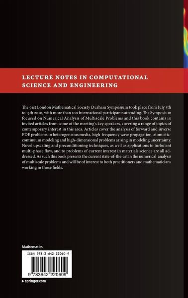 The 91st London Mathematical Society Durham Symposium took place from July 5th to 15th 2010, with more than 100 international participants attending. The Symposium focused on Numerical Analysis of Multiscale Problems and this book contains 10 invited articles from some of the meeting's key speakers, covering a range of topics of contemporary interest in this area. Articles cover the analysis of forward and inverse PDE problems in heterogeneous media, high-frequency wave propagation, atomistic-continuum modeling and high-dimensional problems arising in modeling uncertainty. Novel upscaling and preconditioning techniques, as well as applications to turbulent multi-phase flow, and to problems of current interest in materials science are all addressed. As such this book presents the current state-of-the-art in the numerical analysis of multiscale problems and will be of interest to both practitioners and mathematicians working in those fields.