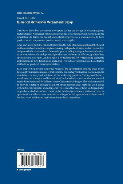 Each chapter begins with a rigorous review of the optimization strategy used, and is followed by numerous examples that combine the strategy with either electromagnetic simulations or analytical solutions of the scattering problem. Throughout the text, we address the strengths and limitations of each method, as well as which numerical methods are best suited for different types of metamaterial designs. This book is intended to provide a detailed enough treatment of the mathematical methods used, along with sufficient examples and additional references, that senior level undergraduates or graduate students who are new to the fields of plasmonics, metamaterials, or optimization methods; have an understanding of which approaches are best-suited for their work and how to implement the methods themselves.