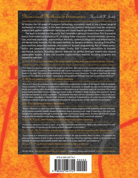 To harness the full power of computer technology, economists need to use a broad range of mathematical techniques. In this book, Kenneth Judd presents techniques from the numerical analysis and applied mathematics literatures and shows how to use them in economic analyses. The book is divided into five parts. Part I provides a general introduction. Part II presents basics from numerical analysis on R^n, including linear equations, iterative methods, optimization, nonlinear equations, approximation methods, numerical integration and differentiation, and Monte Carlo methods. Part III covers methods for dynamic problems, including finite difference methods, projection methods, and numerical dynamic programming. Part IV covers perturbation and asymptotic solution methods. Finally, Part V covers applications to dynamic equilibrium analysis, including solution methods for perfect foresight models and rational expectation models. A website contains supplementary material including programs and answers to exercises.