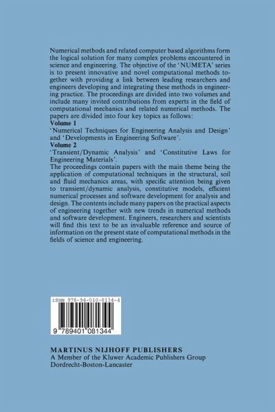 Numerical methods and related computer based algorithms form the logical solution for. many complex problems encountered in science and engineering. Although numerical techniques are now well established, they have continued to expand and diversify, particularly in the fields of engineering analysis and design. Various engineering departments in the University College of Swansea, in particular, Civil, Chemical, Electrical and Computer Science, have groups working in these areas. It is from this mutual interest that the NUMETA conference series was conceived with the main objective of providing a link between engineers developing new numerical techniques and those applying them in practice. Encouraged by the success of NUMETA '85, the second conference, NUMETA '87, was held at Swansea, 6-10 July 1987. Over two hundred and twenty abstracts were submitted for consideration together with a number of invited papers from experts in the field of numerical methods. The final selection ofcontributed and invited papers were of a high quality and have culminated in the two volumes which form these proceedings. This volume contains papers on the themes of 'Numerical Techniques for Engineering Analysis and Design' and 'Developments in Engineering Software'. Many new developments on a wide variety of topics have been reported and these proceedings contain a wealth of information and references which we believe will be of great interest to theoreticians and practising engineers alike.