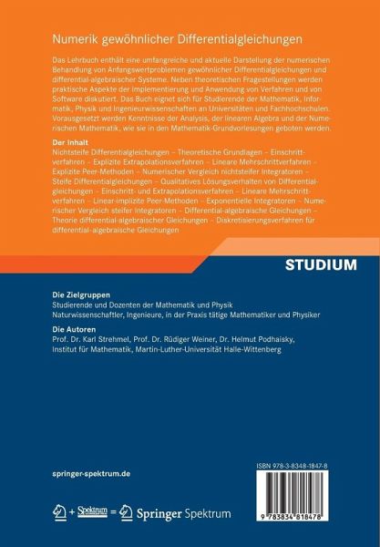 Das Lehrbuch enthält eine umfangreiche und aktuelle Darstellung der numerischen Behandlung von Anfangswertproblemen gewöhnlicher Differentialgleichungen und differential-algebraischer Systeme. Neben theoretischen Fragestellungen werden praktische Aspekte der Implementierung und Anwendung von Verfahren und von Software diskutiert. Das Buch eignet sich für Studierende der Mathematik, Informatik, Physik und Ingenieurwissenschaften an Universitäten und Fachhochschulen. Vorausgesetzt werden Kenntnisse der Analysis, der linearen Algebra und der Numerischen Mathematik, wie sie in den Mathematik-Grundvorlesungen geboten werden.