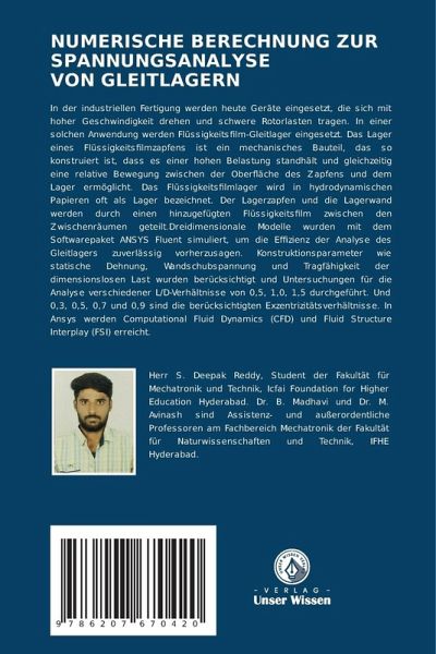 In der industriellen Fertigung werden heute Geräte eingesetzt, die sich mit hoher Geschwindigkeit drehen und schwere Rotorlasten tragen. In einer solchen Anwendung werden Flüssigkeitsfilm-Gleitlager eingesetzt. Das Lager eines Flüssigkeitsfilmzapfens ist ein mechanisches Bauteil, das so konstruiert ist, dass es einer hohen Belastung standhält und gleichzeitig eine relative Bewegung zwischen der Oberfläche des Zapfens und dem Lager ermöglicht. Das Flüssigkeitsfilmlager wird in hydrodynamischen Papieren oft als Lager bezeichnet. Der Lagerzapfen und die Lagerwand werden durch einen hinzugefügten Flüssigkeitsfilm zwischen den Zwischenräumen geteilt.Dreidimensionale Modelle wurden mit dem Softwarepaket ANSYS Fluent simuliert, um die Effizienz der Analyse des Gleitlagers zuverlässig vorherzusagen. Konstruktionsparameter wie statische Dehnung, Wandschubspannung und Tragfähigkeit der dimensionslosen Last wurden berücksichtigt und Untersuchungen für die Analyse verschiedener L/D-Verhältnisse von 0,5, 1,0, 1,5 durchgeführt. Und 0,3, 0,5, 0,7 und 0,9 sind die berücksichtigten Exzentrizitätsverhältnisse. In Ansys werden Computational Fluid Dynamics (CFD) und Fluid Structure Interplay (FSI) erreicht.