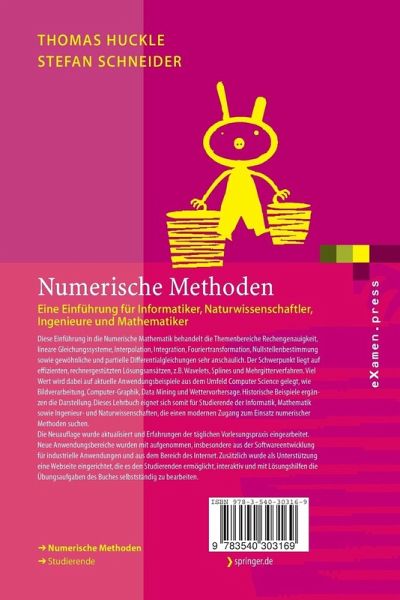 Diese Einführung in die Numerische Mathematik behandelt die Themenbereiche Rechengenauigkeit, lineare Gleichungssysteme, Interpolation, Integration, Fouriertransformation, Nullstellenbestimmung sowie gewöhnliche und partielle Differentialgleichungen sehr anschaulich. Der Schwerpunkt liegt auf effizienten, rechnergestützten Lösungsansätzen, z. B. Wavelets, Splines und Mehrgitterverfahren. Viel Wert wird dabei auf aktuelle Anwendungsbeispiele aus dem Umfeld Computer Science gelegt, wie Bildverarbeitung, Computer-Graphik, Data Mining und Wettervorhersage. Historische Beispiele ergänzen die Darstellung. Dieses Lehrbuch eignet sich somit für Studierende der Informatik, Mathematik sowie Ingenieur- und Naturwissenschaften, die einen modernen Zugang zum Einsatz numerischer Methoden suchen.