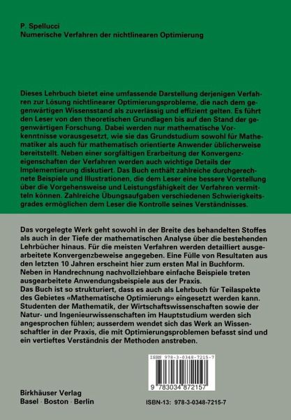 Dieses Lehrbuch bietet eine umfassende Darstellung derjenigen Verfahren zur Lösung nichtlinearer Optimierungsprobleme, die nach dem gegen- wärtigen Wissensstand als zuverlässig und effizient gelten. Es führt den Leser von den theoretischen Grundlagen bis auf den Stand der gegen- wärtigen Forschung. Dabei werden nur mathematische Vorkenntnisse vorausgesetzt, wie sie das Grundstudium sowohl für Mathematiker als auch für mathematisch orientierte Anwender üblicherweise bereitstellt. Neben einer sorgfältigen Erarbeitung der Konvergenzeigenschaften der Verfahren werden auch wichtige Details der Implementierung diskutiert. Das Buch enthält zahlreiche durchgerechnete Beispiele und Illustrationen, die dem Leser eine bessere Vorstellung über die Vorgehensweise und Leistungsfähigkeit der Verfahren vermitteln können. Zahlreiche Übungs- aufgaben verschiedenen Schwierigkeitsgrades ermöglichen dem Leser die Kontrolle seines Verständnisses. Das vorgelegte Werk geht sowohl in der Breite des behandelten Stoffes als auch in der Tiefe der mathematischen Analyse über die bestehenden Lehrbücher hinaus. Für die meisten Verfahren werden detailliert ausgearbeitete Konvergenzbeweise angegeben. Eine Fülle von Resultaten aus den letzten 10 Jahren erscheint hier zum ersten Mal in Buchform. Neben in Handrechnung nachvollziehbare einfache Beispiele treten ausgearbeitete Anwendungsbeispiele aus der Praxis.