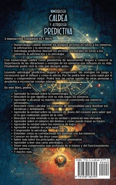 2 manuscritos completos en 1 libro:Numerología Caldea: Desvele los antiguos secretos en torno a los números, la adivinación y la astrología Astrología predictiva: Desvele los secretos ancestrales en torno a los números, la adivinación y la astrología Con numerología caldea como plataforma de lanzamiento, llegará a conocer la importancia de las vibraciones y energías de los números que influyen en su vida. Finalmente podrá vivir la vida que siempre quiso. Leyendo astrología predictiva, llegará a comprender las energías en juego y reconocerá qué le influye y cómo le afecta. Por fin podrá leer su carta natal por sí mismo y comprenderse mejor. Podrá leer las cartas natales de otras personas y ayudarlas a reconectar consigo mismas. En este libro, podrá:Aprender la verdad sobre la numerología Descubrir lo que significa vivir su vida según los números Aprender a alcanzar su máximo potencial conociendo sus números personales Descubrir cómo calcular sus números de personalidad para dominar sus fortalezas y debilidades Aprender la verdad sobre su número de deseo del corazón para saber qué es lo que realmente quiere de la vida Descubrir si está viviendo o no su verdad y potencial más elevados Aprender sobre el número del destino y cómo puede trazar su futuro Aprender la verdad sobre los números de logro Aprender a analizar su carta natal Comprender la astrología Entender cómo se correlacionan los planetas con los números Conocer en detalle las doce casas Saber más sobre los principales aspectos planetarios Aprender a leer una carta astrológica Tener una comprensión más profunda de sí mismo y del funcionamiento del universo Y mucho más.