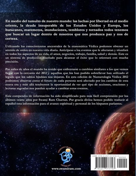 En medio del tumulto de nuestro mundo: las luchas por libertad en el medio oriente, la deuda insuperable de los Estados Unidos y Europa, los huracanes, maremotos, inundaciones, temblores y tornados todos tenemos que buscar un lugar dentro de nosotros que nos produzca paz y nos de certeza. Utilizando los conocimientos ancestrales de la matemática Védica podemos obtener un sentido de orden en nuestra vida diaria incluyendo el amor, negocios, trabajo, familia, salud y demás. Por miles de años el mundo ha tenido que enfrentarse a cambios similares a los que vemos llegar con la cercanía del 2012 y aquellos que los han podido sobrellevar han utilizado el legado que los sabios hindúes nos dejaron. En esta edición de Numerología Védica 2012 podremos observar como el futuro de cada persona será afectado por los cambios de esta nueva era y más allá tendremos la oportunidad de ver qué tipo de acciones, oraciones y lecturas sagradas nos pueden ayudar a cambiar estos eventos.