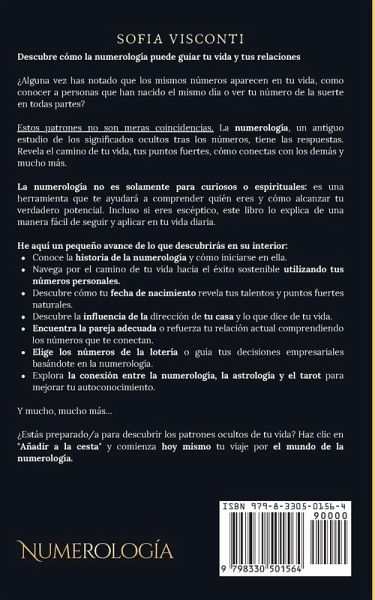 ¿Alguna vez has notado que los mismos números aparecen en tu vida, como conocer a personas que han nacido el mismo día o ver tu número de la suerte en todas partes? Estos patrones no son meras coincidencias. La numerología, un antiguo estudio de los significados ocultos tras los números, tiene las respuestas. Revela el camino de tu vida, tus puntos fuertes, cómo conectas con los demás y mucho más. La numerología no es solamente para curiosos o espirituales: es una herramienta que te ayudará a comprender quién eres y cómo alcanzar tu verdadero potencial. Incluso si eres escéptico, este libro lo explica de una manera fácil de seguir y aplicar en tu vida diaria. He aquí un pequeño avance de lo que descubrirás en su interior:Conoce la historia de la numerología y cómo iniciarse en ella. Navega por el camino de tu vida hacia el éxito sostenible utilizando tus números personales. Descubre cómo tu fecha de nacimiento revela tus talentos y puntos fuertes naturales. Descubre la influencia de la dirección de tu casa y lo que dice de tu vida. Encuentra la pareja adecuada o refuerza tu relación actual comprendiendo los números que te conectan. Elige los números de la lotería o guía tus decisiones empresariales basándote en la numerología. Explora la conexión entre la numerología, la astrología y el tarot para mejorar tu autoconocimiento. Y mucho, mucho más... ¿Estás preparado/a para descubrir los patrones ocultos de tu vida? Haz clic en "Añadir a la cesta" y comienza hoy mismo tu viaje por el mundo de la numerología.