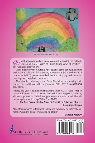 What happens when two women commit to serving the Catholic Church as nuns-Brides of Christ, taking vows of chastity-but fall passionately in love?They must defy the Church's rules against same-sex relationships and blaze a bold trail for a joyous, adventurous life together-at a time when LGBTQ people could be killed for being gay and same-sex marriage was decades in the future.Now Joanie Lindenmeyer and Carol Tierheimer are sharing their courageous and blissful, 40-year journey in NUN BETTER: An AMAZING Love Story. Their breathtaking love story showcases the magic and miracles of love, and two women's unshakable devotion to spreading joy and peace in the spirit of God.This electrifying saga begins with the first time young Joanie heard Sister Carol's voice over the phone, as she embarked on religious training in a convent run by Sister Carol, who was 15 years older. Until then, while growing up separately in Southern California, both women had heard the call at a young age to serve God as nuns, and allowed parallel paths that merged in Lewiston, Idaho.From the magic moment that they first looked into each other's eyes, their spirits danced with knowing that each had found her forever soul mate. From there, they devoted themselves to religious life and training, while secretly cultivating an epic romance.Finally, both women left the Church, embarking on a blissful life together in Washington state, then coastal Oregon. All the while, they created loving communities for gay and lesbian friends who felt safe and celebrated.Meanwhile, Joanie and Carol petitioned the Catholic Church to allow gay marriage, but despite their fervent prayers, hope and requests of priests to perform their sacramental union, a Catholic marriage was denied.Undaunted, they officially wed with an Episcopalian priest.In the midst of their life of romance, adventures and travels, a health tragedy struck Carol, and Joanie's loving care of her life partner personified their wedding vow of "in sickness and in health." Then, after Carol went to heaven, Joanie honored their dream of composing their story in a book to share with people everywhere. Nun Better shares their trailblazing journey in a world where their forbidden love exploded like a sunburst of joy and peace for all who knew them. Now this book will do that for readers around the world, and can be especially affirming for LGBTQ+ individuals who are seeking hope and help to find love, peace and spiritual comfort.