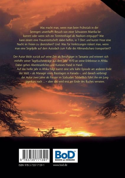 Was macht man, wenn man beim Frühstück in der Serengeti unverhofft Besuch von einer Schwarzen Mamba bekommt oder wenn sich ein Termitenhügel als Nashorn entpuppt? Wie kann einem eine Frauenzeitschrift dabei helfen, in T-Shirt und kurzer Hose eine Nacht im Freien zu überstehen? Und: Was für Verletzungen riskiert man, wenn man eine Segeljolle auf dem Autodach zum Fuße des Kilimandscharo transportiert?Der Autor blickt zurück auf seine Zeit als Berufsjäger in Tansania und erinnert sich mithilfe seiner Tagebucheinträge aus dem Jahr 1970 an seine Erlebnisse in Afrika. Dabei gehen Abenteuerliches und Kurioses Hand in Hand.Auf das heiße Jahr in Afrika folgt zuerst eine sehr kalte Episode am anderen Ende der Welt - als Manager eines Basislagers in Alaska -, und danach verbringt der Autor zwei Jahre als Förster im Südsudan. Schließlich führt ihn ein Jungjägerkurs nach ... - aber das wird erst am Ende des Buches verraten.