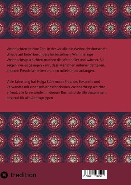 Weihnachten ist eine Zeit, in der wir alle die Weihnachtsbotschaft "Friede auf Erde" besonders herbeisehnen. Warmherzige Weihnachtsgeschichten machen die Welt heller und wärmer. Sie zeigen, wie es gelingen kann, dass Menschen miteinander teilen, anderen Freude schenken und neu miteinander anfangen.Viele Jahre lang hat Helga Stährmann Freunde, Bekannte und Verwandte mit einer selbstgeschriebenen Weihnachtsgeschichte erfreut, alle Jahre wieder. In diesem Buch sind sie alle versammelt, passend für alle Altersgruppen.
