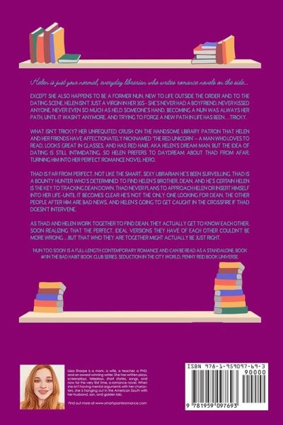 Helen is just your normal, everyday librarian who writes romance novels on the side... except she also happens to be a former nun, new to life outside the order and to the dating scene. Helen isn't just a virgin in her 30s- she's never had a boyfriend, never kissed anyone, never even so much as held someone's hand. Becoming a nun was always her path, until it wasn't anymore, and trying to forge a new path in life has been...tricky. What isn't tricky? Her unrequited crush on the handsome library patron that Helen and her friends have affectionately nicknamed 'The Red Unicorn' - a man who loves to read, looks great in glasses, and has red hair, aka Helen's dream man. But the idea of dating is still intimidating, so Helen prefers to daydream about Thad from afar, turning him into her perfect romance novel hero. Thad is far from perfect, not like the smart, sexy librarian he's been surveilling. Thad is a bounty hunter who's determined to find Helen's brother, Dean, and he's certain Helen is the key to tracking Dean down. Thad never plans to approach Helen or insert himself into her life-until it becomes clear he's not the only one looking for Dean. The other people after him are bad news, and Helen's going to get caught in the crossfire if Thad doesn't intervene. As Thad and Helen work together to find Dean, they actually get to know each other, soon realizing that the perfect, ideal versions they have of each other couldn't be more wrong...but that who they are together might actually be just right. 'Nun Too Soon' is a full-length contemporary romance and can be read as a standalone. Book #1 in the Bad Habit Book Club series, Seduction in the City World, Penny Reid Book Universe.
