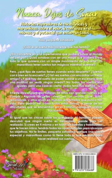 ¡Hola pequeña soñadora! ¿Cuál es el sueño más increíble que has tenido? ¿Fue convertirte en una superheroína que pudiera salvar al mundo del peligro? ¿Quizás soñabas con ser un hada que pudiera crear todo lo que quisiera con sólo un movimiento de su varita? ¡Es maravilloso tener sueños tan mágicos mientras duermes! Pero, ¿qué tipo de sueños tienes cuando estás despierta? ¿Sueñas con ir bien en la escuela? ¿O tal vez sueñas con encontrar un mejor amigo? ¿Qué te parece soñar que puedes subirte a un escenario frente a una multitud de personas sin sentir ningún miedo? No todos los sueños son iguales, pero una cosa es cierta: ¡todos tenemos sueños! En este libro encontrarás historias de chicas que han seguido y realizado sus sueños. Algunos de ellos viven en un mundo que quizá reconozcas, y otros en mundos encantados que nunca has visto. Pero podrás ver cómo todas estas chicas, a pesar de todas las dificultades que encontraron en el camino, creyeron en sí mismas y en sus capacidades y lograron realizar sus sueños. Al igual que las chicas sobre las que vas a leer, tú también descubrirás que ningún sueño es demasiado grande para ser realizado. Si crees en ti misma y en todos los talentos y habilidades que te hacen única, tendrás todas las oportunidades para alcanzar tus objetivos. No te limites, pequeña soñadora, porque una chica especial y maravillosa como tú tiene todo lo que necesita para hacer realidad sus sueños. Lo que encontrarás en este libro: 10 historias inspiradoras para niñas sobre ""autoestima, valor, fuerza interior y amor propio"". Un estilo de escritura sencillo y atractivo, adecuado tanto para la lectura compartida como para la independiente La identificación con los personajes, que, aunque son ficticios, siempre se combinan con temas de la vida real de los niños Bellas imágenes para acompañar la lectura y estimular la imaginación Moral y mensajes de la vida con reflexiones y participación en la narración A las niñas les encanta este libro porque les ayuda a: Creer en sus sueños Desarrollar la confianza en sí mismas y en sus capacidades Afrontar mejor las situaciones difíciles Superar los miedos y ser valiente Comprender la importancia de las relaciones con los padres y los amigos 2 Regalos para ti que puedes descargar del sitio web de Special Art: Diario de los sueños de los niños (PDF) Frases motivadoras para colorear para niños (PDF) Haz clic en ""comprar ahora"" y ayuda a que una niña nunca deje de soñar y creer en sí misma. (Una idea de regalo perfecta)