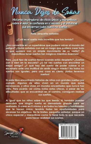 Hola, pequeño soñador. ¿Cuál es el sueño más increíble que has tenido? ¿Era convertirte en un superhéroe que pudiera salvar al mundo del peligro? ¿Quizá soñabas con ser un mago que pudiera crear todo lo que quisiera con un simple movimiento de su varita? ¡Es maravilloso tener sueños tan mágicos mientras duermes! Pero, ¿qué tipo de sueños tienes cuando estás despierto? ¿Sueñas con ir bien en la escuela? ¿O tal vez sueñas con encontrar un mejor amigo? ¿Y qué hay del sueño de poder subirse a un escenario ante una multitud sin sentir ningún miedo? No todos los sueños son iguales, pero una cosa es cierta: ¡todos tenemos sueños! En este libro encontrarás historias de niños con grandes sueños por cumplir. Algunos de ellos viven en un mundo que quizá reconozcas, y otros viven en mundos encantados que nunca has visto. Pero podrás ver cómo todos estos chicos, a pesar de las dificultades que se encuentran en el camino, consiguen realizar sus sueños. Al igual que los niños sobre los que leerás, tú también puedes descubrir que ningún sueño es demasiado grande para ser realizado. Si crees en ti mismo y en todos los talentos y habilidades que te hacen único, tendrás todas las oportunidades para alcanzar tus objetivos. No te limites, pequeño soñador, porque un chico especial y maravilloso como tú tiene todo lo que necesita para hacer realidad sus sueños. Lo que encontrarás en este libro: 10 historias inspiradoras para niños sobre autoestima, valor, fuerza interior y amor propio. Un estilo de escritura sencillo y atractivo, adecuado tanto para la lectura compartida como para la independiente La identificación con los personajes, que, aunque son ficticios, siempre se combinan con temas de la vida real de los niños Bellas imágenes para acompañar la lectura y estimular la imaginación Moral y mensajes de la vida con reflexiones y participación en la narración A los niños les encanta este libro porque les ayuda a: Creer en sus sueños Desarrollar la confianza en sí mismo y en sus capacidades Afrontar mejor las situaciones difíciles Superar los miedos y ser valiente Comprender la importancia de las relaciones con los padres y los amigos 2 Regalos para ti que puedes descargar del sitio web de Special Art: Diario de los sueños de los niños (PDF) Frases motivadoras para colorear para niños (PDF) Haz clic en ""comprar ahora"" y ayuda a que un niño nunca deje de soñar y creer en sí mismo. (Una idea de regalo perfecta)