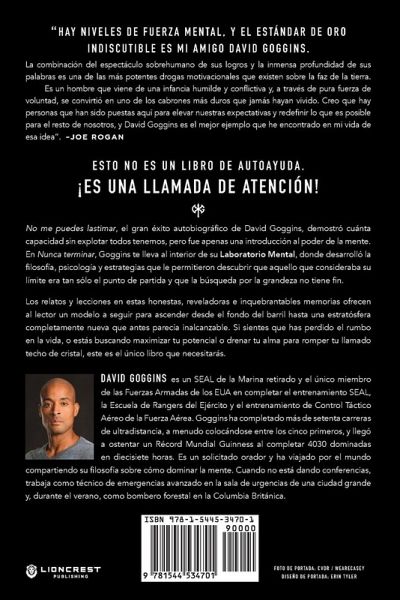 Más de 1 millón de copias vendidas Esto no es un libro de autoayuda. ¡Es una llamada de atención! No me puedes lastimar, el gran éxito autobiográfico de David Goggins, demostró cuánta capacidad sin explotar todos tenemos, pero fue apenas una introducción al poder de la mente. En Nunca terminar, Goggins te lleva al interior de su Laboratorio Mental, donde desarrolló la filosofía, psicología y estrategias que le permitieron descubrir que aquello que consideraba su límite era tan sólo el punto de partida y que la búsqueda por la grandeza no tiene fin. Los relatos y lecciones en estas honestas, reveladoras e inquebrantables memorias ofrecen al lector un modelo a seguir para ascender desde el fondo del barril hasta una estratósfera completamente nueva que antes parecía inalcanzable. Si sientes que has perdido el rumbo en la vida, o estás buscando maximizar tu potencial o drenar tu alma para romper tu llamado techo de cristal, este es el único libro que necesitarás.
