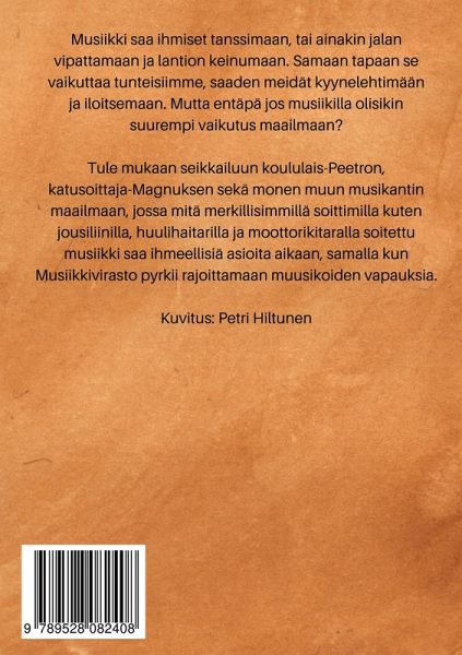 Musiikki saa ihmiset tanssimaan, tai ainakin jalan vipattamaan ja lantion keinumaan. Samaan tapaan se vaikuttaa tunteisiimme, saaden meidät joko kyynelehtimään tai iloitsemaan. Mutta entäpä jos musiikilla olisikin suurempi vaikutus maailmaan? Tule mukaan seikkailuun koululais-Peetron, katusoittaja-Magnuksen sekä monen muun musikantin maailmaan, jossa mitä merkillisimmillä soittimilla kuten jousiliinilla, huulihaitarilla ja moottorikitaralla soitettu musiikki saa ihmeellisiä asioita aikaan, samaan aikaan kun Musiikkivirasto pyrkii rajoittamaan muusikoiden vapauksia. Kuvitus: Petri Hiltunen