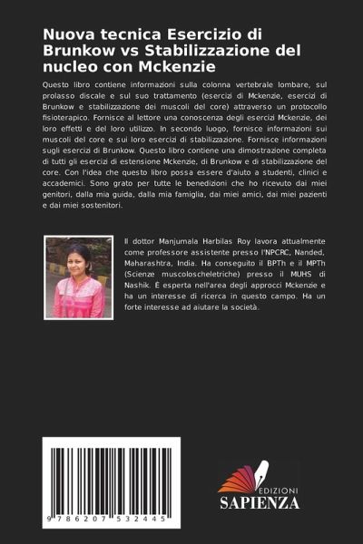 Questo libro contiene informazioni sulla colonna vertebrale lombare, sul prolasso discale e sul suo trattamento (esercizi di Mckenzie, esercizi di Brunkow e stabilizzazione dei muscoli del core) attraverso un protocollo fisioterapico. Fornisce al lettore una conoscenza degli esercizi Mckenzie, dei loro effetti e del loro utilizzo. In secondo luogo, fornisce informazioni sui muscoli del core e sui loro esercizi di stabilizzazione. Fornisce informazioni sugli esercizi di Brunkow. Questo libro contiene una dimostrazione completa di tutti gli esercizi di estensione Mckenzie, di Brunkow e di stabilizzazione del core. Con l'idea che questo libro possa essere d'aiuto a studenti, clinici e accademici. Sono grato per tutte le benedizioni che ho ricevuto dai miei genitori, dalla mia guida, dalla mia famiglia, dai miei amici, dai miei pazienti e dai miei sostenitori.