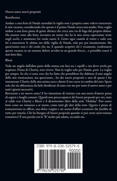 Nuovo anno, nuovi propositi Beneficenza Andare a una festa di Natale aziendale la vigilia non è proprio come volevo trascorrere le mie vacanze, considerando che questo è il primo Natale senza mia madre. Non voglio andare a una festa piena di gente ubriaca che cerca una via di fuga dal proprio dolore. Ma mentre sono alla festa, incontro un uomo che ha la mia stessa espressione triste negli occhi, e nemmeno lui vuole essere lì. Getto ogni cautela al vento e vado con lui a trascorrere le ultime ore della vigilia di Natale, solo per poi innamorarmi. Ma quest'uomo non è chi credo che sia. E quando scoprirò chi è veramente, trasformerò queste vacanze in un enorme dolore avvolto in un grande fiocco... o potrebbe essere il mio lieto fine. Rhett Vedo un angelo dall'altra parte della stanza con luci tra i capelli e ora devo averla per respirare. Prima di Charity, non vivevo. Non la voglio solo per Natale, però. La voglio per sempre. So che ci sono cose che ho fatto che potrebbero far dubitare il mio angelo delle mie motivazioni, ma quest'anno... ho dei nuovi propositi e uno di questi è far innamorare Charity della mia anima nera e darmi il suo cuore in cambio del mio. Spero solo che sia abbastanza da farle desiderare di stare con me per tutto il nuovo anno e per tutti i giorni successivi. Benvenuti a un nuovo anno! E ho intenzione di iniziare con una storia d'amore piena di segreti e luoghi comuni. Quindi non preoccupatevi dei buoni propositi per ora, state al caldo con Charity e Rhett e il diciottesimo libro della serie "Holiday". Può essere letto come un romanzo a sé stante, come tutti gli altri della serie. Questo è pieno di romanticismo in ufficio, una dolce vergine e un uomo d'affari scontroso che farebbe di tutto per tenerla. Chi ha bisogno di buoni propositi quando si può avere un'avventura romantica? È una parola con la "R" molto più adatta, secondo me.