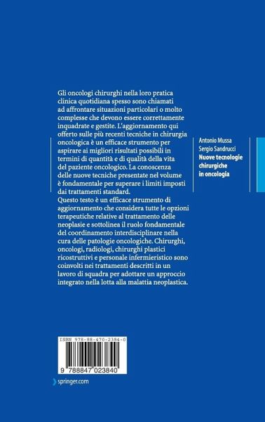 I chirurghi oncologici nella loro pratica clinica quotidiana spesso sono chiamati ad affrontare situazioni particolari o molto complesse che devono quindi essere in grado di individuare e di saper gestire. L'aggiornamento qui offerto sulle più recenti evoluzioni tecniche in chirurgia oncologica è necessario per raggiungere i migliori risultati possibili in termini di remissione e di qualità della vita del paziente. L'introduzione delle nuove tecniche presentate nel volume è fondamentale per superare i limiti imposti dalle procedure standard. Nuove tecnologie chirurgiche in oncologia è un efficace strumento di aggiornamento che copre tutte le opzioni terapeutiche nel trattamento delle neoplasie e sottolinea la centralità del coordinamento interdisciplinare nella cura delle patologie oncologiche. Chirurghi, oncologi, radiologi, chirurghi estetici e personale infermieristico sono chiamati a lavorare in squadra e ad adottare un approccio integrato alla cura del paziente.