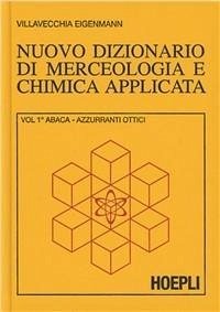 Il Nuovo Dizionario di Merceologia e Chimica Applicata è un completo rifacimento del notissimo Villavecchia, la cui prima edizione risale al 1896. Il testo contiene oltre 3500 voci monografiche sui più diversi elementi di interesse chimico-merceologico. Ogni voce è esaminata per caratteristiche chimico-fisiche, saggi e reazioni, metodologie produttive, tipologia commerciale, impieghi, tossicità, infiammabilità, norme di manipolazione, imballo, sicurezza, trasporto. Le voci sono suddivise in sette volumi così articolati: volume 1, abaca ¿ azzurranti ottici; volume 2, babassu ¿ cobalto (ossidi); volume 3, cobalto (sali di) ¿ fisetina; volume 4, fisostigmina ¿ mangimi; volume 5, mangimi ¿ polistirene; volume 6, polistirene ¿ surgelati; volume 7, tabacco ¿ zucchero. Un indice analitico di oltre 20.000 termini conclude il settimo volume e permette una rapida ricerca delle voci desiderate.