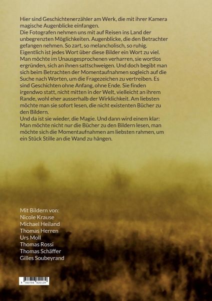 Hier sind Geschichtenerzähler am Werk, die mit ihrer Kamera magische Augenblicke einfangen. Die Fotografen nehmen uns mit auf Reisen ins Land der unbegrenzten Möglichkeiten. Augenblicke, die den Betrachter gefangen nehmen. So zart, so melancholisch, so ruhig. Eigentlich ist jedes Wort über diese Bilder ein Wort zu viel. Man möchte im Unausgesprochenen verharren, sie wortlos ergründen, sich an ihnen sattschweigen. Und doch begibt man sich beim Betrachten der Momentaufnahmen sogleich auf die Suche nach Worten, um die Fragezeichen zu vertreiben. Es sind Geschichten ohne Anfang, ohne Ende. Sie…mehr