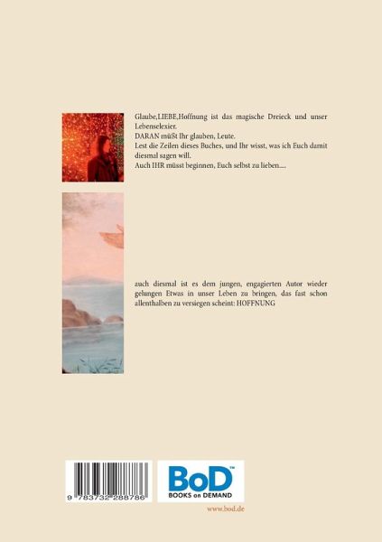 Glaube, LIEBE, Hoffnung ist das magische Dreieck und unser Lebenselexier.DARAN müßt Ihr glauben, Leute.Lest die Zeilen dieses Buches, und Ihr wisst, was ich Euch damit diesmal sagen will.Auch IHR müsst beginnen, Euch selbst zu lieben....