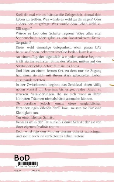 Stell dir mal vor, du hättest die Gelegenheit einmal dein Leben zu treffen. Was würde es wohl zu dir sagen? Oder anders herum gefragt. Was würde dein Leben wohl zu DIR sagen?Würde es Lob oder Schelte regnen? Wäre alles eitel Sonnenschein oder gäbe es ein konstruktives Kritik-Gespräch?Diese, wohl einmalige Gelegenheit, eben genau DAS herauszufinden, bekommt Josefine Jordan, kurz Jojo.An einem Tag, der eigentlich wie jeder andere beginnt, trifft sie, im wahrsten Sinne des Wortes, mitten auf der Straße der Schlag. Sofort fällt sie ins Koma. Und hier, an einem fernen Ort, zu dem nur sie Zugang hat, muss sie sich mit ihrem stark gebeutelten Leben auseinandersetzten. In der Zwischenzeit beginnt das Schicksal einen völlig neuen Mantel um Josefines bisheriges, reales Dasein zu stricken. Veränderungen, die sie sich wohl in ihren kühnsten Träumen niemals hätte ausmalen können.Ob Josefine jedoch jemals diese unglaublichen Veränderungen erleben darf? Dazu müsste sie nur eine Kleinigkeit tun.Nur einen kleinen Schritt.Denn es ist in der Tat nur ein kleiner Schritt der sie von ihrer eigenen Realität trennt. Doch wird Jojo den Mut zu diesem Schritt aufbringen und somit auch ihr verbittertes Leben retten?