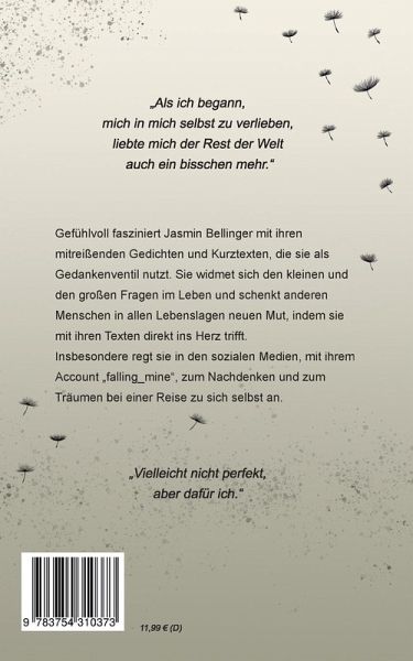Gefühlvoll fasziniert Jasmin Bellinger mit ihren mitreisenden Gedichten und Kurztexten, die sie als Gedankenventil nutzt. Sie widmet sich den kleinen und den großen Fragen im Leben und schenkt anderen Menschen in allen Lebenslagen neuen Mut, indem sie mit ihren Texten direkt ins Herz trifft. Insbesondere regt Jasmin Bellinger zum Nachdenken und zum Träumen bei einer Reise zu sich selbst an.