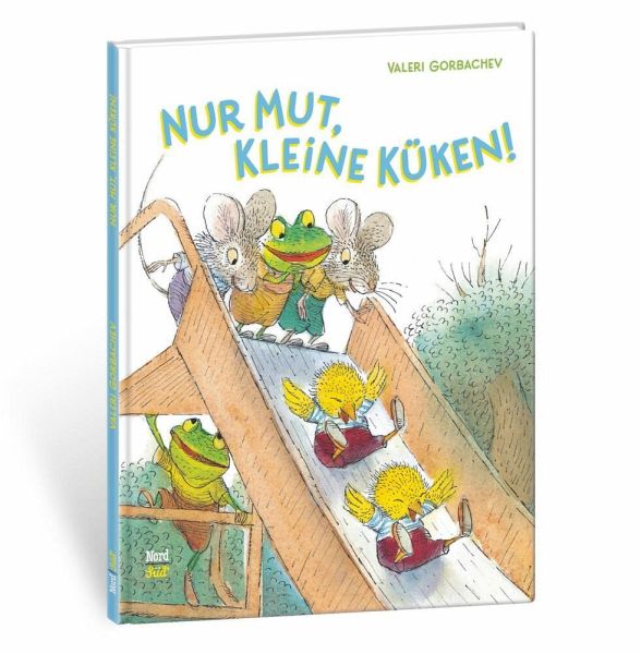Die Hunde auf der Wippe, die Schweinchen auf dem Karussell, die Katzenkinder auf den Schaukeln und die…mehrMama Huhn und ihre zwei kleinen Küken gehen zum ersten Mal auf den Spielplatz. An Mamas Hand schauen sie auf Schaukeln, Wippen und viele spielende Kinder. Sie haben auch ein wenig Angst, es ist „sooo viel los!“ Da wird Dreirad gefahren und Ball gespielt und schwatzende Hühner sitzen auf der Bank. Die Hunde auf der Wippe, die Schweinchen auf dem Karussell, die Katzenkinder auf den Schaukeln und die Maus auf der Rutsche, laden die beiden kleinen Küken ein auch mitzumachen. Aber die meinen „Dafür sind wir noch zu klein.“ Doch Frösche und Mäuse sind auch klein und sie meinen, die Küken sollten es versuchen. So steigen die beiden die Leiter hoch, doch oben angekommen, haben sie doch Angst zu rutschen. Da kommt ein hilfsbereiter Biber und er rutsch mit den beiden gemeinsam. „Huiiih!“ Da macht Rutschen Spaß und bald geht es auch allein.