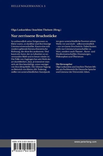 Inhalt: Martin Roussel: Kleists Rhetorik des Schweigens - Rolf-Peter Janz: Affektregie bei Kleist - Alexandra Rassidakis: Im Tollhaus der Deutungen. Der hermeneutische Akt bei Heinrich von Kleist - Katherina Mitralexi: Narrative Strategien in Kleists Penthesilea - Stefan Lindinger: «Gott hat gerichtet!» - ? - Das Gottesurteil. Ein Motiv in Heinrich von Kleists Das Käthchen von Heilbronn und Der Zweikampf - Chara Bakonikola: Mystische Erfahrung und sinnliche Realität in Kleists Theaterstücken - Elena Noussia: Das Wunderbare im Käthchen von Heilbronn - Anastasia Chournazidi: Der Mythos als Terror und Spiel. Heinrich von Kleists Amphitryon - Katerina Karakassi: Mythos Familie oder die Novellen Das Erdbeben in Chili, Der Findling und Die Marquise von O... - Michael Weitz: Figuren des Widerstands auf der Bühne des Marionettentheaters. Zum Verhältnis von Moralistik und Manie bei Kleist - Georgios Sagriotis: «Das letzte Kapitel von der Geschichte der Welt». Ästhetik und Geschichte in Kleists Über das Marionettentheater - Giorgos Michailidis: Über das Marionettentheater - Georg Xiropaidis: Die radikale Materialität des erhabenen Sehens. Kleists gemischte Empfindungen vor Friedrichs Seelandschaft - Kostas Ioannidis: Kleist und Friedrich. Die Malfläche und die gemalte Welt - Olga Laskaridou: Kleists ästhetisches Programm der «Erfindung nach eigenthümlichen Gesetzen» - Joachim Theisen: Poetologischste Anekdoten. Unwahrscheinliche Wahrhaftigkeiten - Konstantinos Kotsiaros: Kleist und Kafka: Eine Wahlverwandtschaft? - Eleni Georgopoulou: Die Dimension des Bösen. Von der Theodizee in Heinrich von Kleists Das Erdbeben in Chili zur Dialektik der Aufklärung in Christa Wolfs Medea. Stimmen - Virginia Agapi Spyratou: «Den Zahn schlägt sie in seine weiße Brust». Penthesilea: Das Monströse bei Kleist, Kokoschka und Kristeva - Minas I. Alexiadis: Viktor Ullmanns Oper Der zerbrochene Krug - Evangelia Tsiavou: Anatomie des Lesens. Heinrich von Kleists Die Marquise von O... - Elena Karakouli: Penthesilea, das «unspielbare» Stück, auf die Bühne bringen - Anastasia Daskaroli: Die Marquise von O... in drei griechischen Übersetzungen. Ein Beitrag zur Rezeption Kleists in Griechenland.