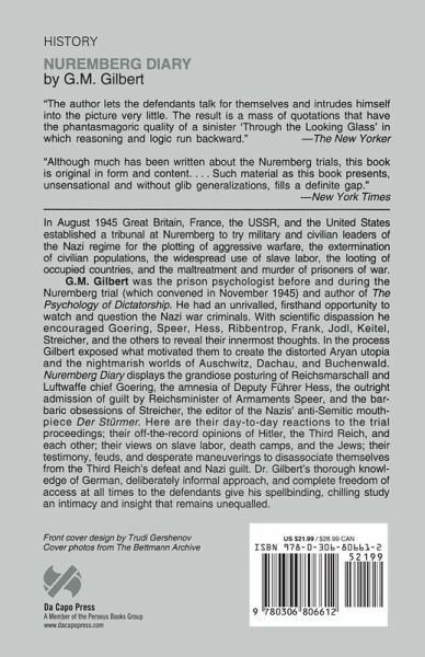 In August 1945 Great Britain, France, the USSR and the United States established a tribunal at Nuremberg to try military and civilian leaders of the Nazi regime for the plotting of aggressive warfare, the extermination of civilian populations, the widespread use of slave labor, the looting of occupied countries, and the maltreatment and murder of prisoners of war. G. M. Gilbert was the prison psychologist before and during the Nuremberg trial. He had an unrivalled, firsthand opportunity to watch and question the Nazi war criminals. With scientific dispassion he encouraged Goering, Speer, Hess Ribbentrop, Frank, Jodl, Keitel, Streicher, and the others to reveal their innermost thoughts.