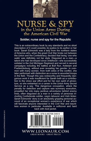Soldier, nurse and spy for the Republic This is an extraordinary book by any standards and no short description of it could possibly do justice to its author or her book. Sarah Edmonds was a lady from the northern states of America who, when the great Civil War broke out between the Union and the Confederacy, decided that being 'one who waits' was definitely not her style. Disguised as a man-a talent she had developed since childhood-she successfully enlisted in the 2nd Michigan Regiment and served in several campaigns including the battles at Bull Run, Antietam and Fredericksburg, without ever revealing her gender. In common with many women, from both sides of the conflict, she later performed with distinction as a nurse to wounded troops in the field. Though this was noteworthy and frequently dangerous work it was insufficient for Sarah both as a contribution to the Union war effort and for her own spirit of adventure, so she embarked on a career in the Union Army Secret Service as a spy. This dangerous occupation, where the penalty for detection and capture was summary execution, propelled her into many perilous adventures behind enemy lines, often disguised as a man in a variety of personas including Confederate soldier, negro labourer and Irish tinker. Sarah Edmonds' story is an absolutely gripping personal account of an exceptional woman's experience of war which will fascinate anyone interested in the Civil War and dauntless women in particular. Available in softcover and hard back with dust jacket.