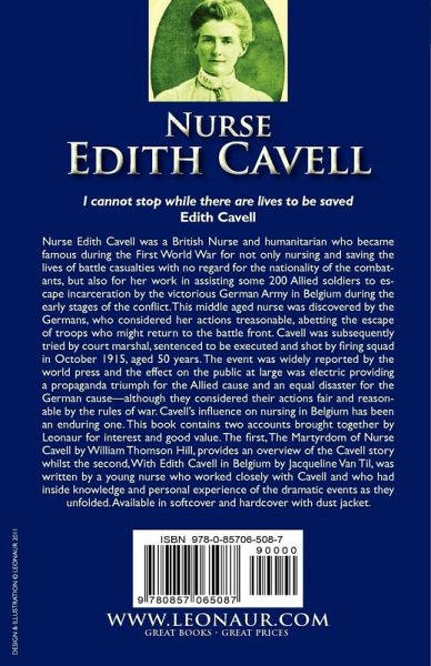 I cannot stop while there are lives to be saved Edith Cavell Nurse Edith Cavell was a British Nurse and humanitarian who became famous during the First World War for not only nursing and saving the lives of battle casualties with no regard for the nationality of the combatants, but also for her work in assisting some 200 Allied soldiers to escape incarceration by the victorious German Army in Belgium during the early stages of the conflict. This middle aged nurse was discovered by the Germans, who considered her actions treasonable, abetting the escape of troops who might return to the battle front. Cavell was subsequently tried by court marshal, sentenced to be executed and shot by firing squad in October 1915, aged 50 years. The event was widely reported by the world press and the effect on the public at large was electric providing a propaganda triumph for the Allied cause and an equal disaster for the German cause-although they considered their actions fair and reasonable by the rules of war. Cavell's influence on nursing in Belgium has been an enduring one. This book contains two accounts brought together by Leonaur for interest and good value. The first, The Martyrdom of Nurse Cavell by William Thomson Hill, provides an overview of the Cavell story whilst the second, With Edith Cavell in Belgium by Jacqueline Van Til, was written by a young nurse who worked closely with Cavell and who had inside knowledge and personal experience of the dramatic events as they unfolded. Available in softcover and hardcover with dust jacket.
