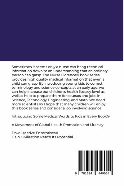 Sometimes it seems only a nurse can bring technical information down to an understanding that an ordinary person can grasp. The Nurse Florence® book series provides high quality medical information that even a child can grasp. By introducing young kids to correct terminology and science concepts at an early age, we can help increase our children's health literacy level as well as help to prepare them for courses and jobs in Science, Technology, Engineering, and Math. We need more scientists so I hope that many children will enjoy this book series and consider a job involving science. Introducing Some Medical Words to Kids in Every Book® A Movement of Global Health Promotion and Literacy Dow Creative Enterprises® Help Civilization Reach Its Potential