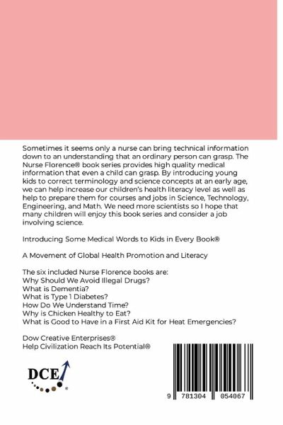 Sometimes it seems only a nurse can bring technical information down to an understanding that an ordinary person can grasp. The Nurse Florence® book series provides high quality medical information that even a child can grasp. By introducing young kids to correct terminology and science concepts at an early age, we can help increase our children's health literacy level as well as help to prepare them for courses and jobs in Science, Technology, Engineering, and Math. We need more scientists so I hope that many children will enjoy this book series and consider a job involving science. Introducing Some Medical Words to Kids in Every Book® A Movement of Global Health Promotion and Literacy The six included Nurse Florence books are: Why Should We Avoid Illegal Drugs? What is Dementia? What is Type 1 Diabetes? How Do We Understand Time? Why is Chicken Healthy to Eat? What is Good to Have in a First Aid Kit for Heat Emergencies? Dow Creative Enterprises® Help Civilization Reach Its Potential®