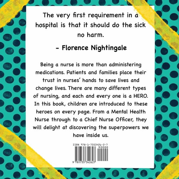 The very first requirement in a hospital is that it should do the sick no harm. - Florence Nightingale Being a nurse is more than administering medications. Patients and families place their trust in nurses' hands to save lives and change lives. There are many different types of nursing, and each and every one is a HERO. In this book, children are introduced to these heroes on every page. From a Mental Health Nurse through to a Chief Nurse Officer, they will delight at discovering the superpowers we have inside us.